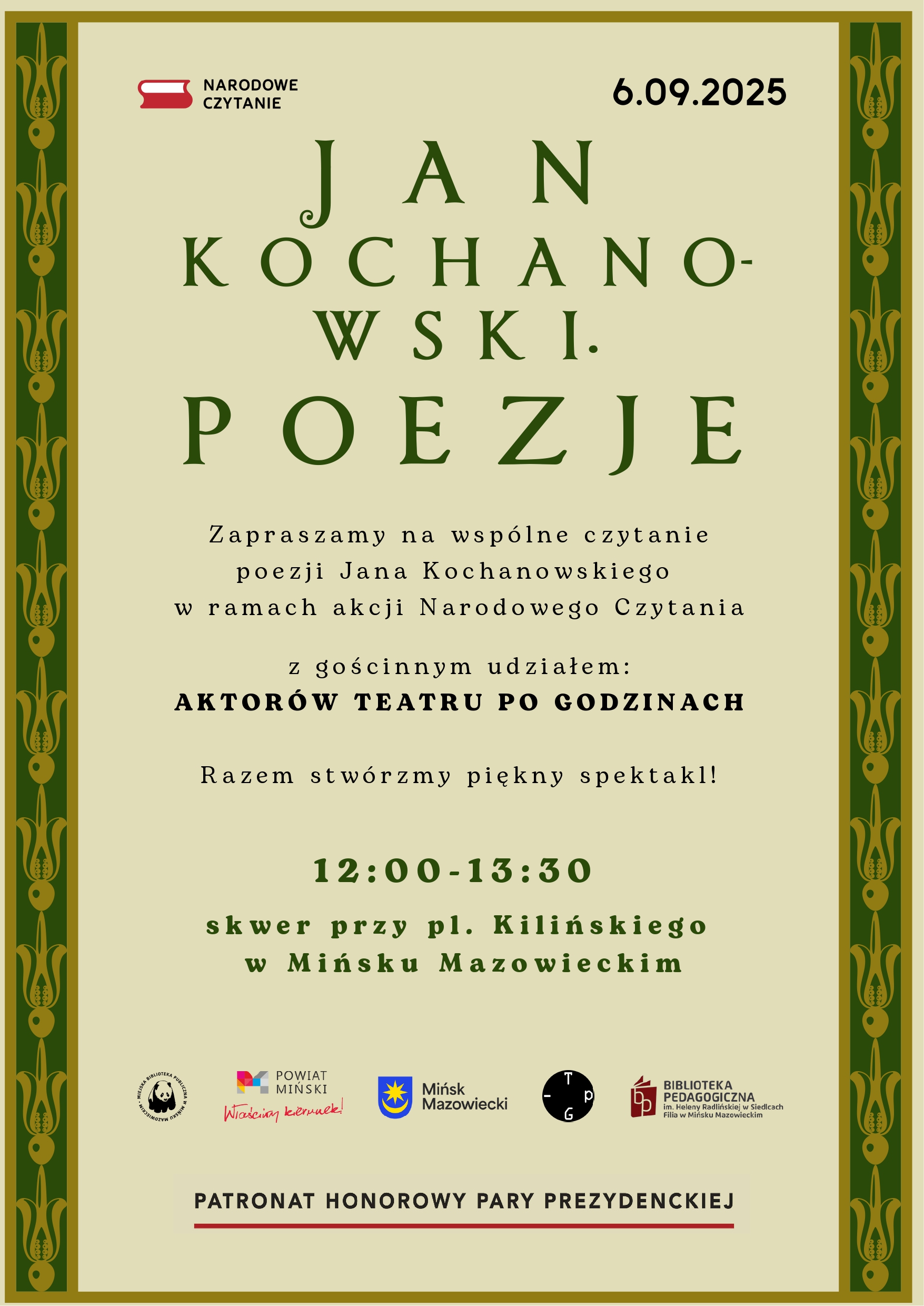 Na skwerze przy Placu Kilińskiego w Mińsku Mazowieckim zaplanowano kolejną odsłonę Narodowego Czytania. Tegoroczna edycja ogólnopolskiej akcji będzie poświęcona twórczości Jana Kochanowskiego – jednego z najwybitniejszych poetów polskiego renesansu.