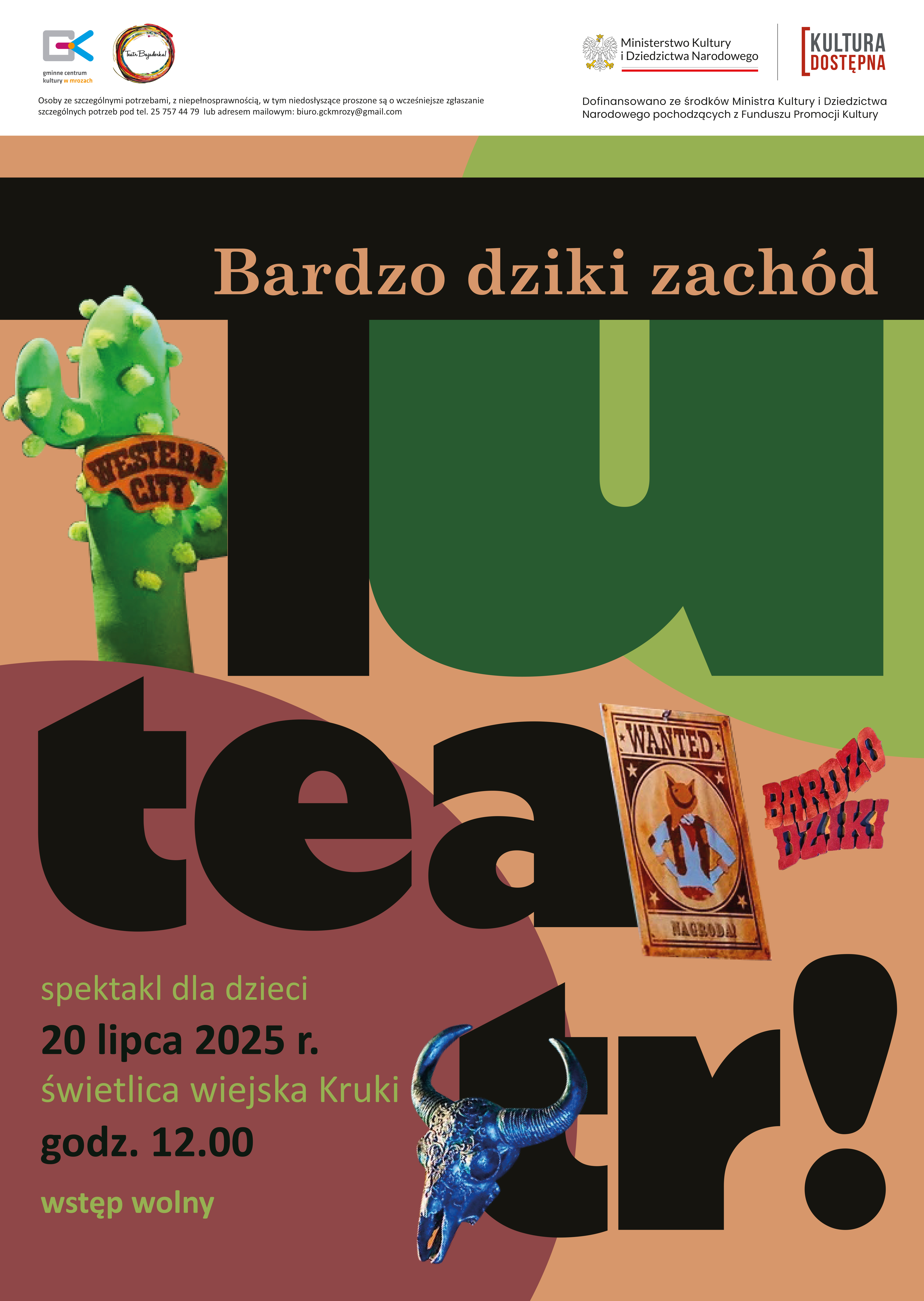 Tego dnia widzowie będą mogli wziąć udział w dwóch wyjątkowych przedstawieniach, pełnych humoru, muzyki, przygód i edukacyjnych treści. Spektakle odbędą się w dwóch różnych lokalizacjach, co umożliwi udział dzieciom i rodzinom z różnych części gminy.Spektakl „Bardzo Dziki Zachód” – godz. 12:00, Kruki