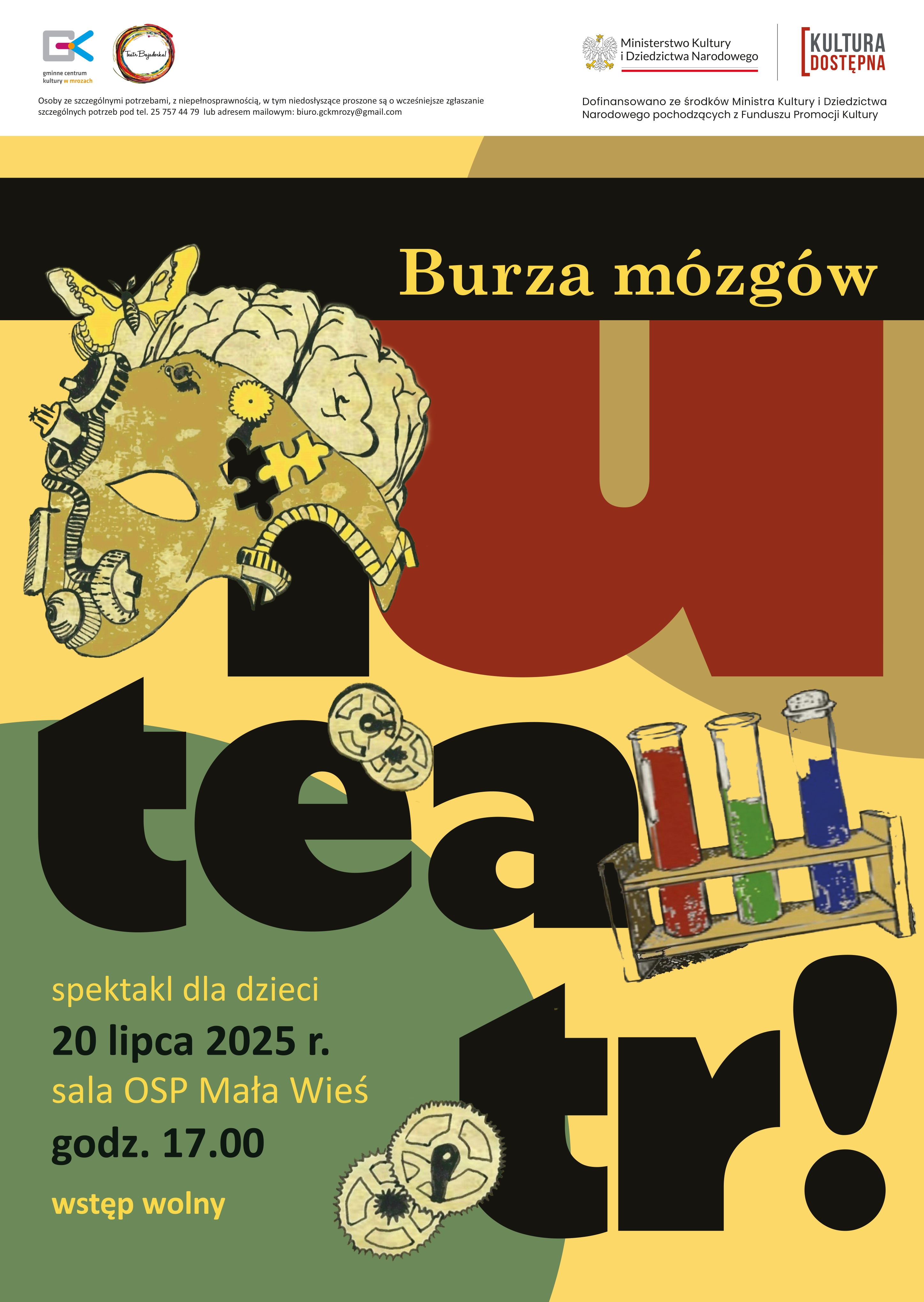 Drugie przedstawienie odbędzie się o godz. 17:00 w sali OSP w Małej Wsi. „Burza mózgów” to spektakl edukacyjno-interaktywny, który przenosi widzów do niezwykłego laboratorium Doktorka Wątróbki. Na scenie pojawią się Robot Andronetka i Szalone Mózgi, a wspólne eksperymenty, zagadki i zadania wciągną najmłodszych w świat nauki i zdrowego stylu życia.