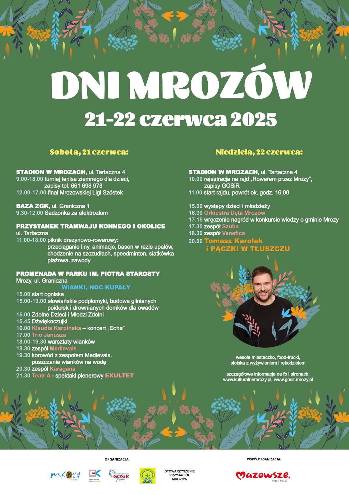 Turniej, piknik, rajd, konkursy i koncerty złożą się na dwudniowe święto Mrozów. Gwiazdą Dni Mrozów będzie Tomasz Karolak z zespołem Paczki w Tłuszczu, których koncert zwieńczy to pełne atrakcji święto. Dni Mrozów zaplanowano 21 i 22 czerwca.