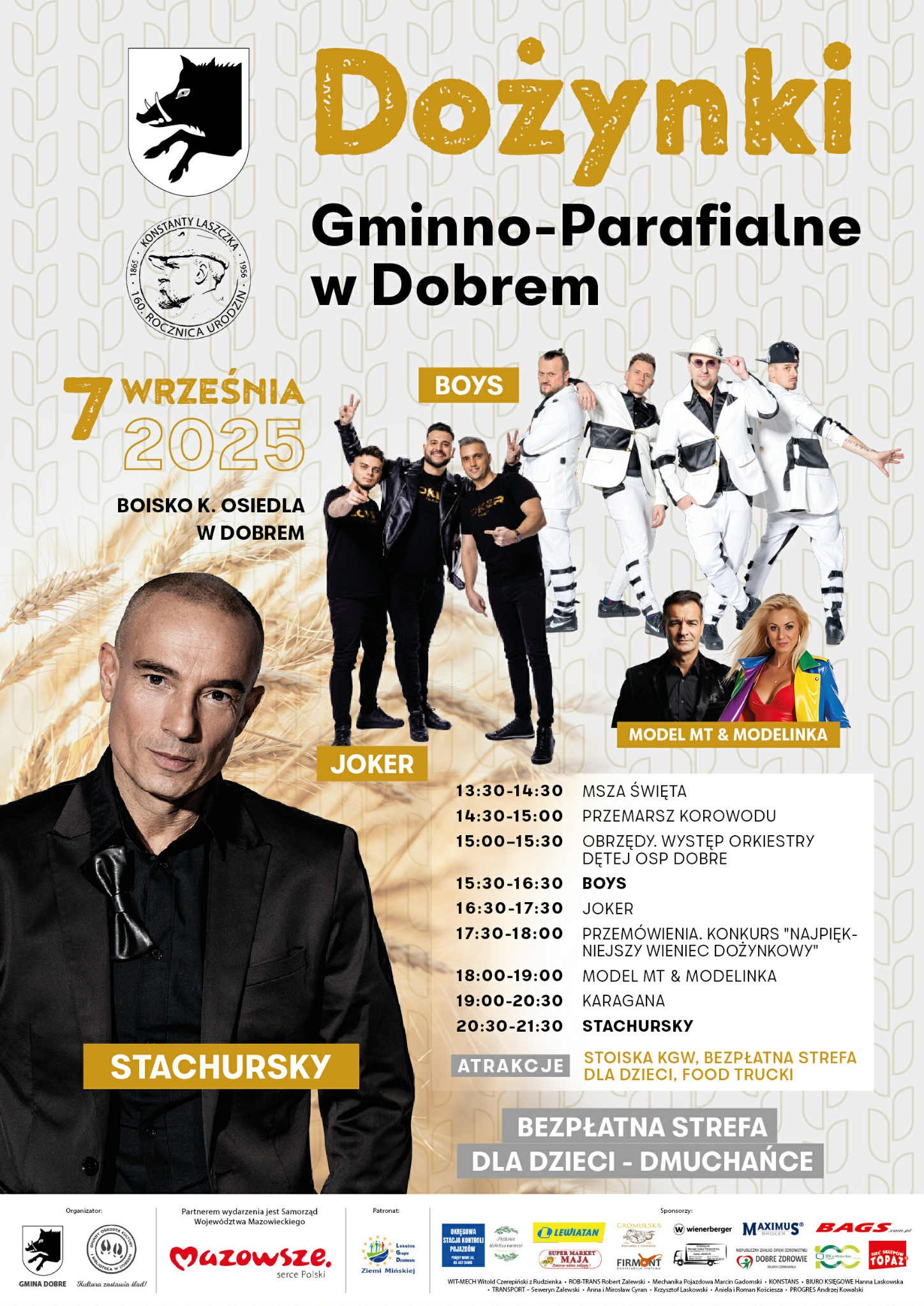 Dożynki Gminno-Parafialne odbędą się w Dobrem, na boisku przy osiedlu w niedzielę, 7 września. W programie zaplanowano tradycyjne święto plonów z częścią obrzędową, koncertami, atrakcjami dla dzieci oraz wspólną zabawą mieszkańców i gości z regionu.