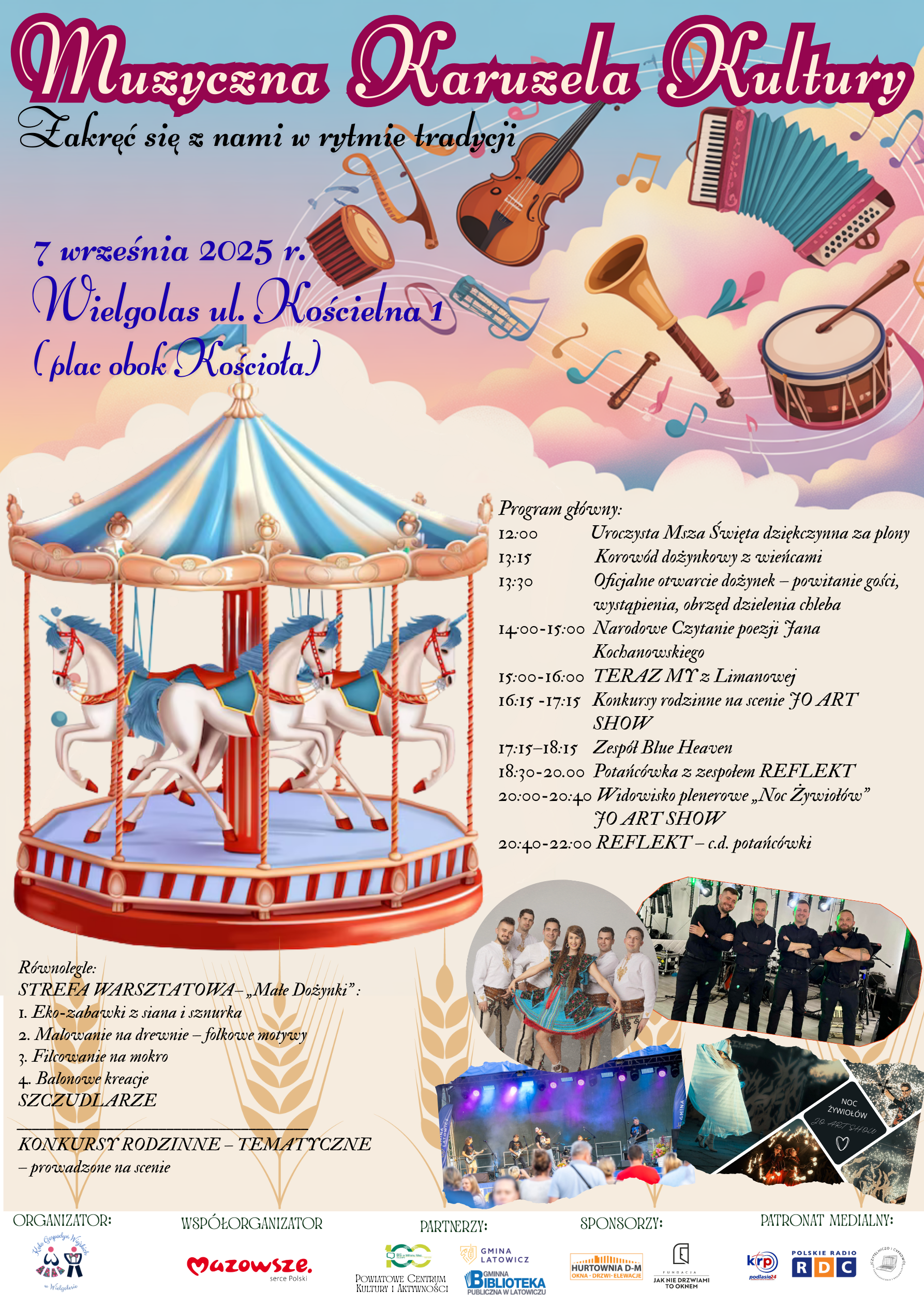 Koło Gospodyń Wiejskich w Wielgolesie zaprasza na wyjątkowe święto plonów – dożynki parafialne połączone z festynem ludowym, które odbędą się 7 września od godz. 12:00 na placu przy ul. Kościelnej 1 w Wielgolesie (teren przy kościele). Tegoroczna edycja odbędzie się pod hasłem: „Muzyczna Karuzela Kultury. Zakręć się z nami w rytmie tradycji”.