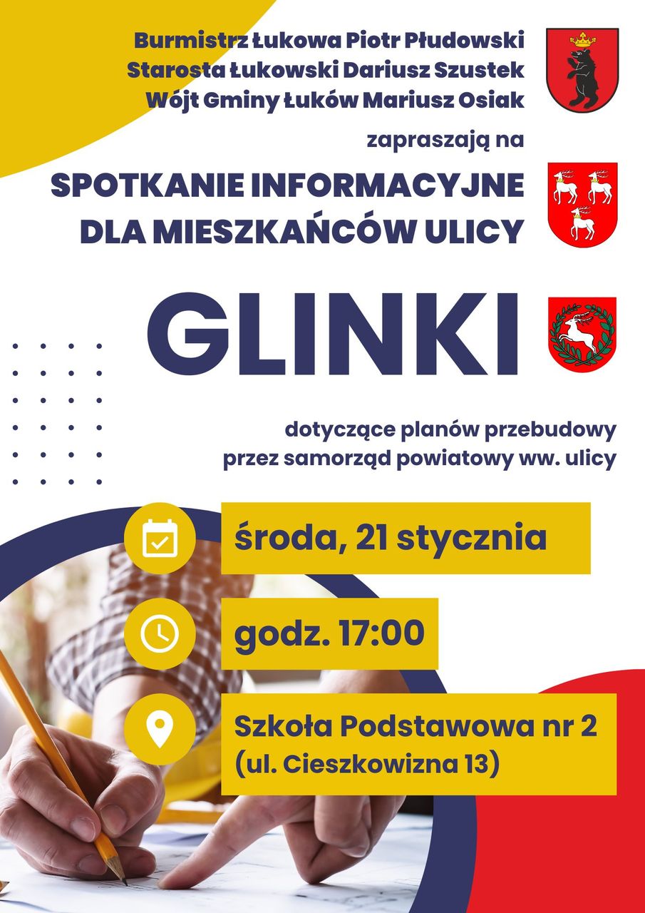 Burmistrz Łukowa Piotr Płudowski, starosta łukowski Dariusz Szustek i wójt gminy Łuków Mariusz Osiak spotkają się z właścicielami nieruchomości położonych przy ulicy Glinki w Łukowie oraz przy drodze biegnącej przez miejscowość Podgaj. Spotkanie, które zaplanowano na 21 stycznia będzie dotyczyć planów przebudowy tej drogi.