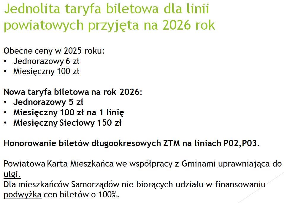 Od stycznia 2026 roku zacznie obowiązywać jednolita taryfa biletowa dla linii powiatowych. Na wybranych liniach, m.in. P02 i P03, honorowane będą bilety długookresowe ZTM, co ułatwi dojazd mieszkańcom Halinowa i Sulejówka do połączeń SKM. Szczegółowe ceny biletów oraz mapa linii zostały przedstawione grafikach poniżej.