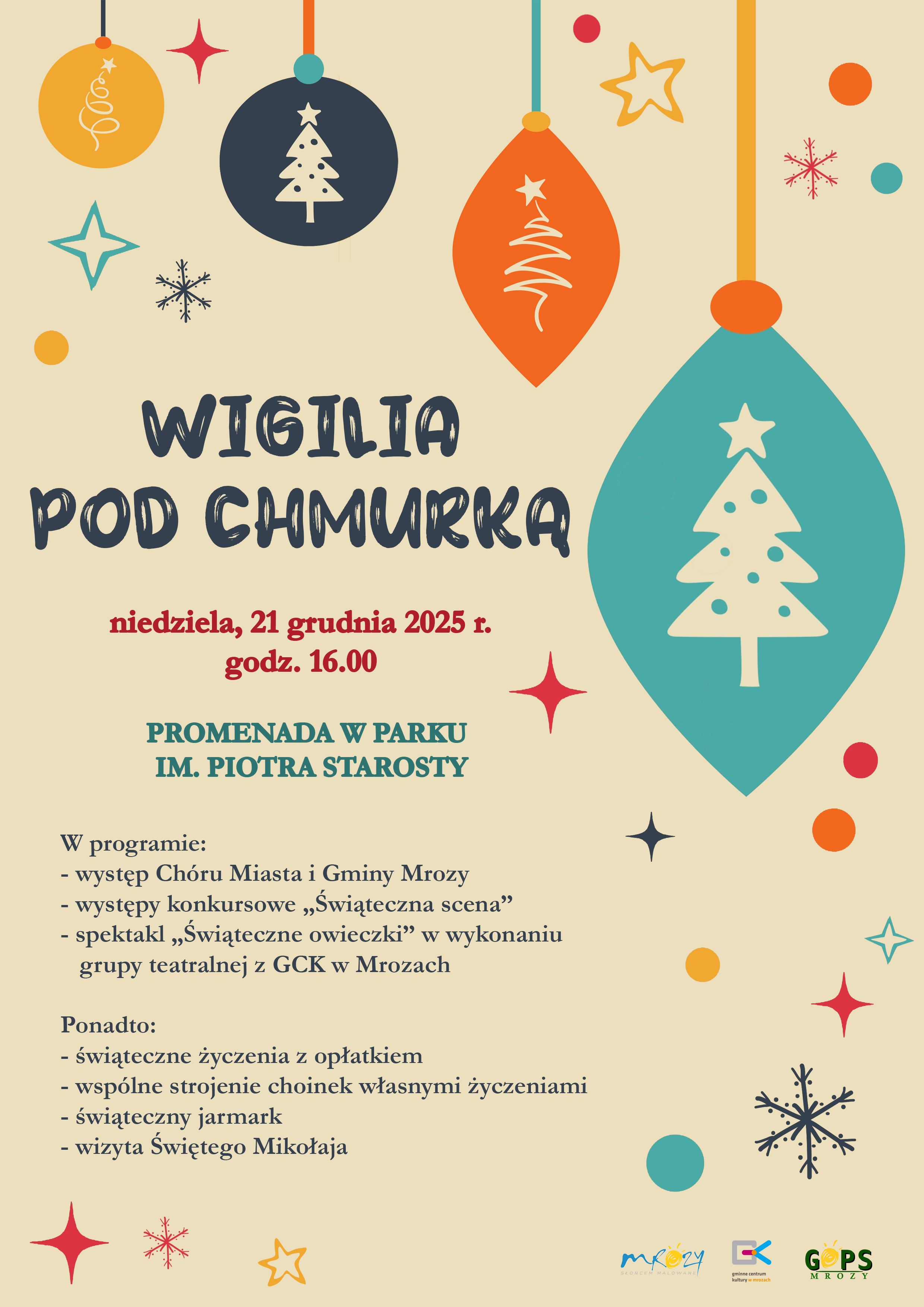 Gminne Centrum Kultury im. H. Wielobyckiej w Mrozach wraz z partnerami zaprasza mieszkańców gminy oraz gości na wyjątkowe, świąteczne spotkanie – „Wigilię pod Chmurką”, które odbędzie się w niedzielę, 21 grudnia o godz. 16.00 na Promenadzie w Parku im. Piotra Starosty.